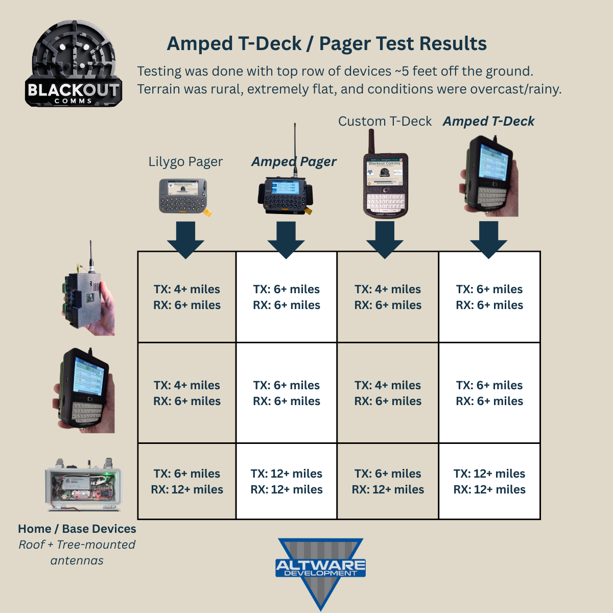 These results are from sending and receiving encrypted text messages and signed delivery confirmations between the amped T-Deck, amped Pager, and base station(s) at various distances.