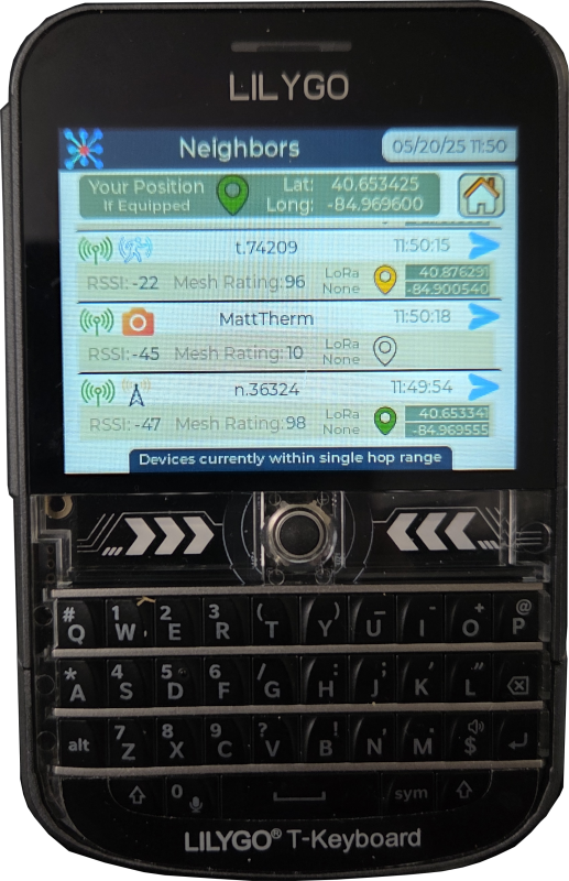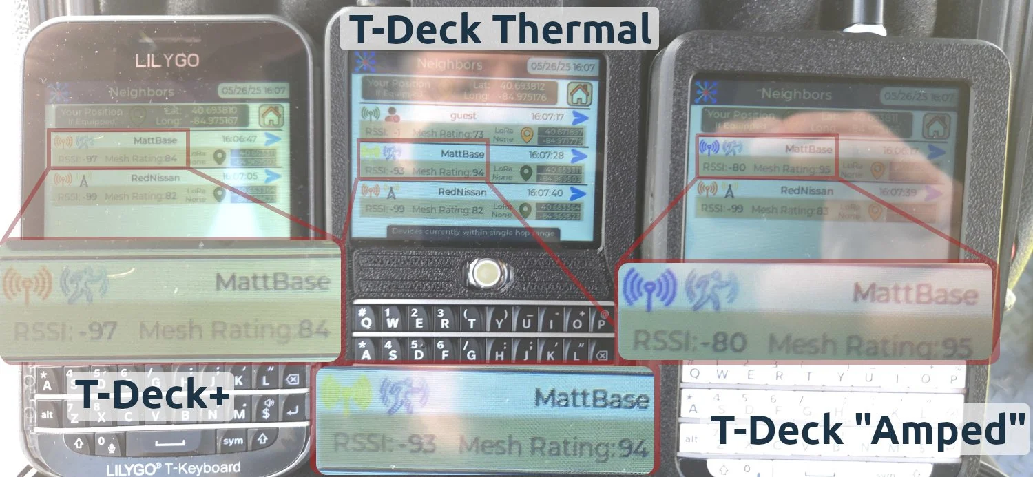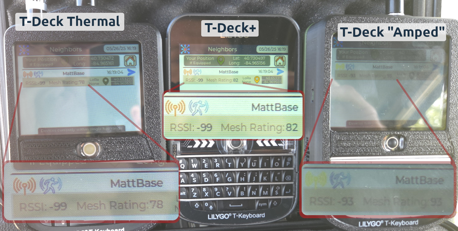 It’s likely the base station intermittently sees the T-Deck+ from here, but clearly it’s got no problem seeing the two T-Decks with external antennas.