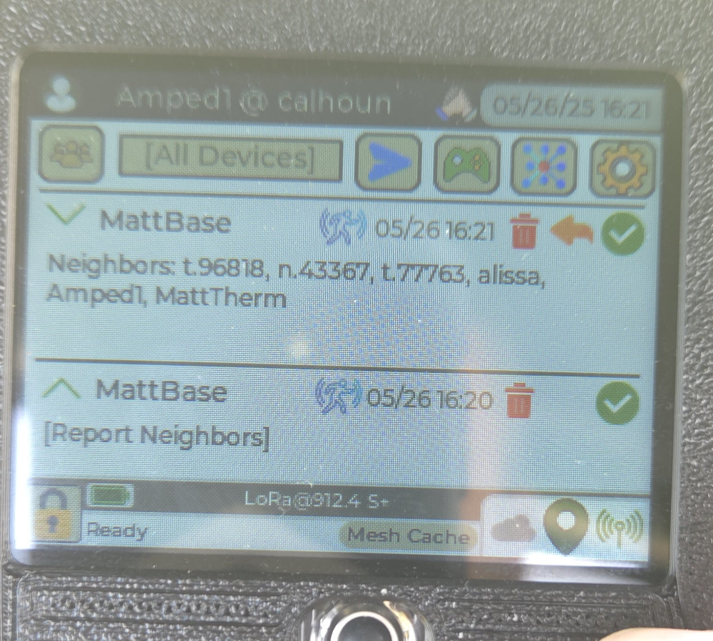 As you can see in the screenshots here, the Blackout Comms mesh firmware allows me to see a live view of which devices/nodes I’m receiving pings from. I’m also able to send messages, which return an ECDSA signed confirmation (shows as check mark), so I know for a fact the message was received and validated, without physically looking at the distant device.