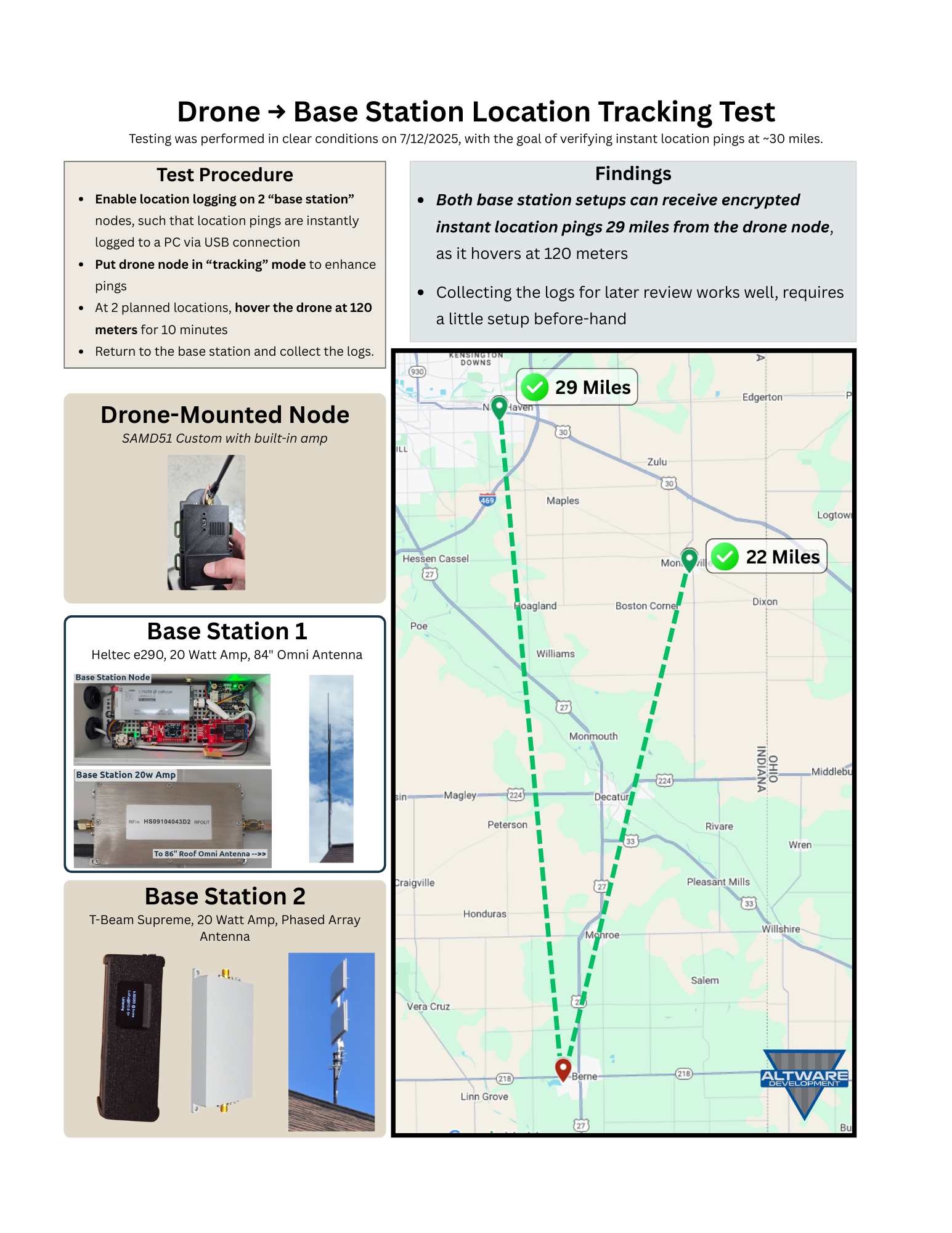 In this set of tests, over the course of two weekends, I used a done-mounted AirBuddy Amped Altware Mesh Node to measure the maximum distance that a 20 watt LoRa base station can track the drone.