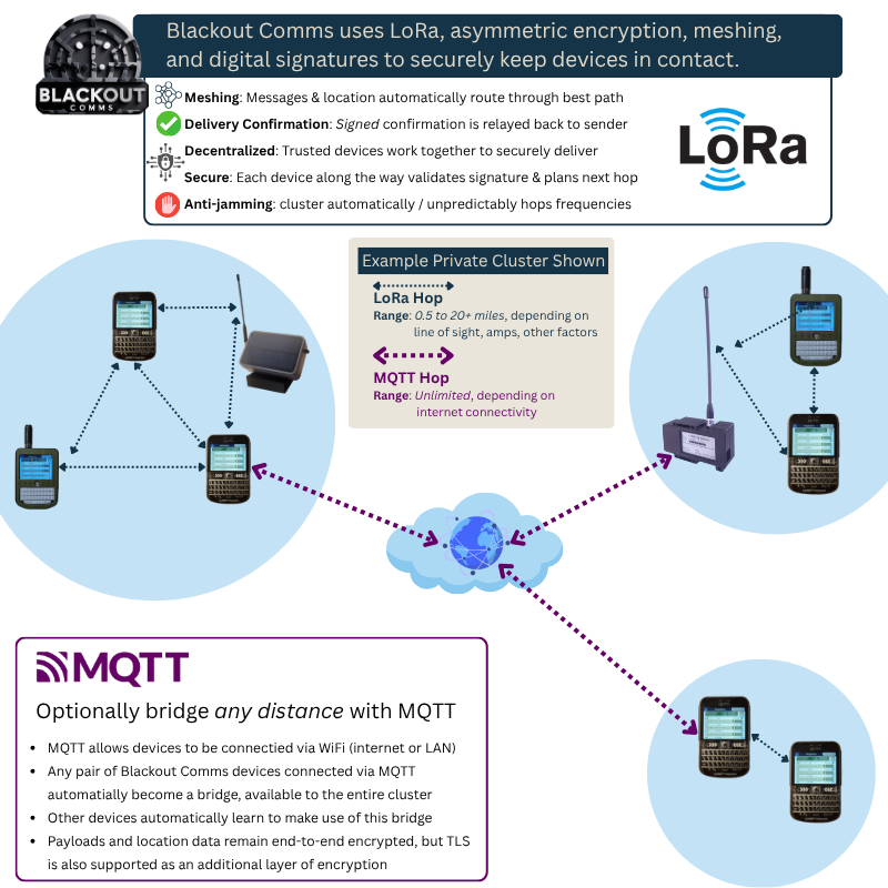 A cluster is a private off-grid mesh communication group, where a “root” (admin) device trusts up to 90 devices and adds them to its “cluster”. Those trusted devices automatically trust one another and work cooperatively as a decentralized and secure off-grid communication mesh network.
