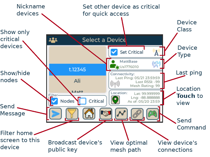 Touch to view the person/node’s info, send them a message, or use GPS to see how to get to them.